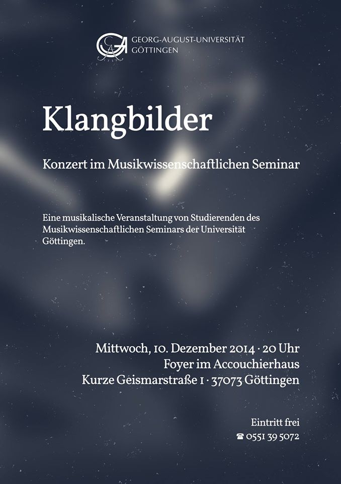 Konzerte am Musikwissenschaftlichen Seminar Klangbilder-Konzert digital, 17.12.2021 Klangbilder-Konzert online 14.12.2020 Klangbilder-Konzert 11.12.2019 Klangbilder-Konzert 17.12.2018 Klangbilder-Konzert 13.12.2017 Improvisationen im Accouchierhaus: 29.11.2017 Klangbilder-Konzert 8.12.2016 Klangbilder-Konzert 10.12.2015 Klangbilder-Konzert am 10.12.2014 (pdf.) Vokalensemble Ars Nova Trajectina (NL) unter der Leitung von Paul Bocken singt Renaissancewerke von Josquin Desprez und Jean Mouton, 15.2.2014 (.pdf) Cafe Mozart spielt im Accouchierhaus am 23.5.2014 (pdf.) Klangbilder-Konzert am 11.12.2013 (pdf.) Klangbilder-Konzert am 15.12.2010 Konzert der Donald Kachambals Kwela Heritage Jazzband des Oral Literature Research Programme, Chileka, Malawi, 3.2.2010 Klangbilder-Konzert am 12.12.2007 (pdf.) Klangbilder-Konzert am 6.12.2006 (pdf.) Musica Viva: Neue Musik an der Universität Göttingen